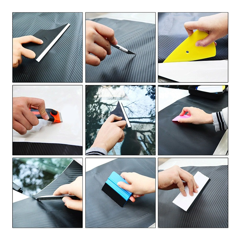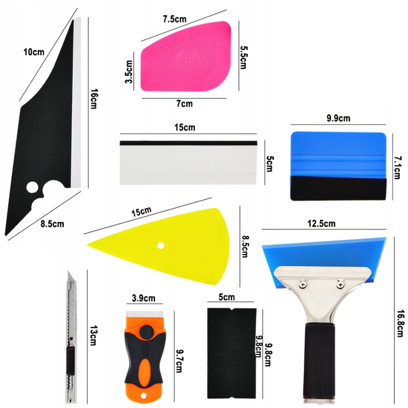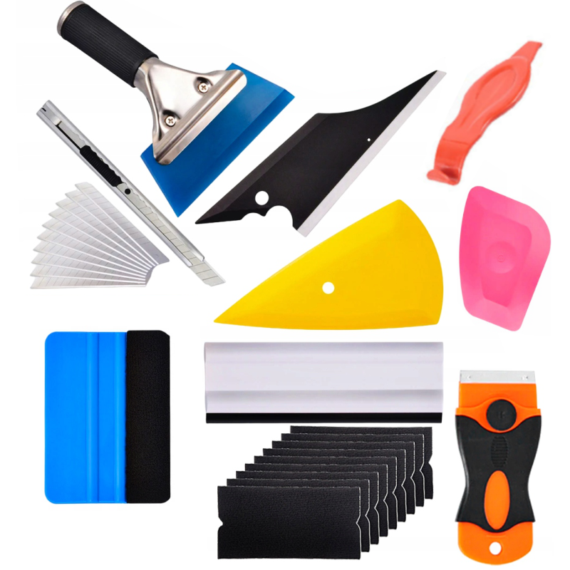 Zestaw 11 profesjonalnych narzędzi gwarantuje elastyczność i efektywność pracy. Wysokiej jakości materiały – odporne tworzywo, miękki filc, trwała guma – zapewniają ochronę aplikowanych powierzchni. Skrobak i nóż umożliwiają czyszczenie i cięcie folii na różnych kształtach, a różne rakle pozwalają dopasować się do wymagających fragmentów – zaokrąglenia, krawędzie, uszczelki. To wszechstronne wyposażenie, które sprawdzi się zarówno u doświadczonych wykonawców, jak i początkujących entuzjastów detailingu.