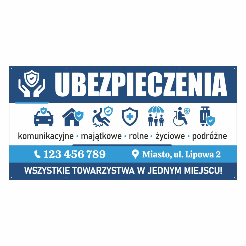 Baner reklamowy dla ubezpieczeń łączy wysoką trwałość z estetycznym wyglądem i elastycznością zastosowania. Solidny materiał zapewnia odporność na deszcz, wiatr i promieniowanie UV, a możliwość edycji wzoru pozwala dopasować przekaz do aktualnej oferty. Dzięki mobilnej formie baner może być łatwo przenoszony i stosowany zamiennie z innymi rozwiązaniami reklamowymi.