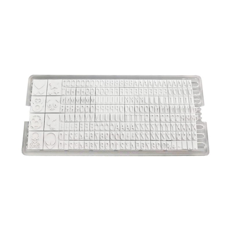 3. Ułóż treść pieczątki w odbiciu lustrzanym. Korzystaj z zestawu czcionek i za pomocą pęsety ułóż poszczególne czcionki w rowkach, które znajdują się w dolnej części pieczątki.