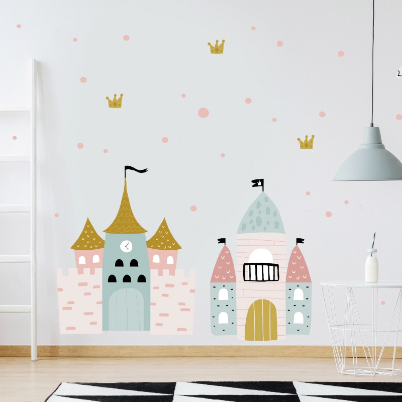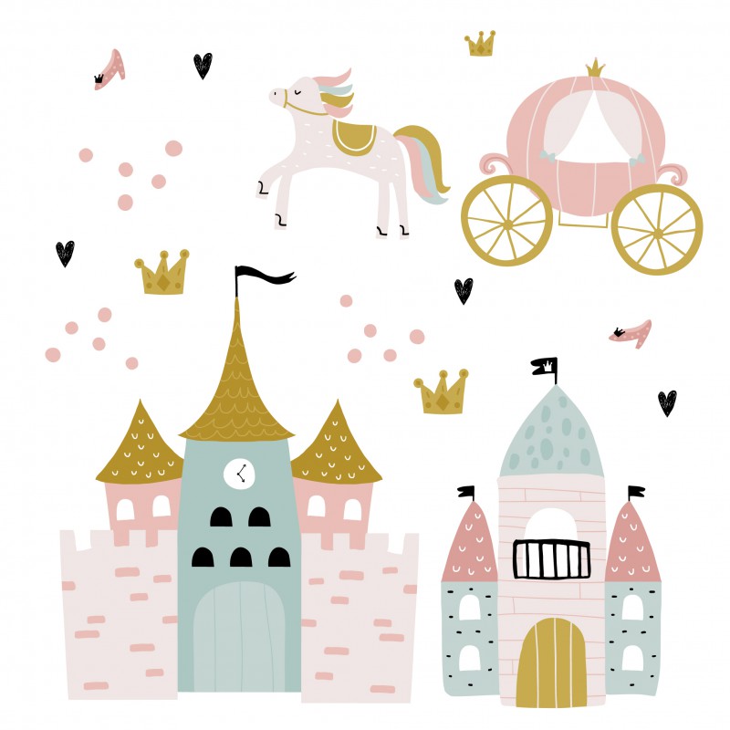 Komplet dekoracyjnych naklejek w kształcie zamku i dorożki.