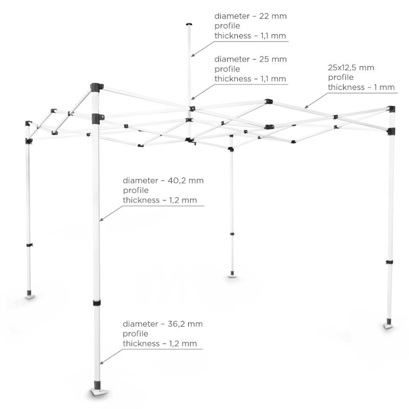 Namiotowy stelaż BLANC wyróżnia się nie tylko wyjątkową trwałością, ale i funkcjonalnością. Dzięki zastosowaniu sześciokątnego profilu, cała konstrukcja zyskuje większą stabilność niż standardowe odpowiedniki. Mobilna torba na kółkach oraz komplet akcesoriów montażowych sprawiają, że rozstawienie namiotu jest szybkie i wygodne – idealne do częstego użytku na wydarzeniach zewnętrznych.
