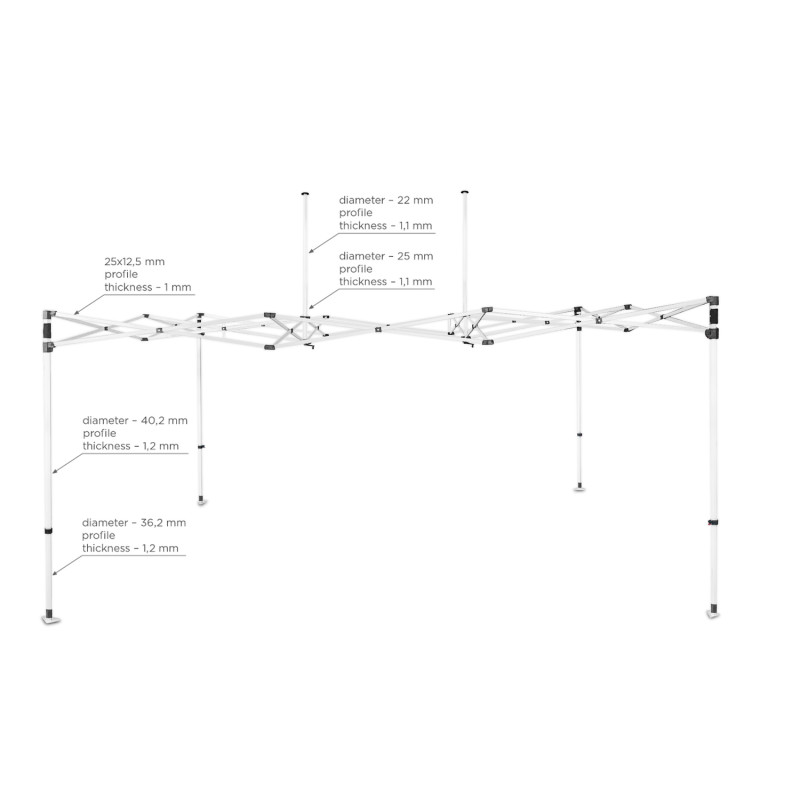 Namiotowy stelaż BLANC wyróżnia się nie tylko wyjątkową trwałością, ale i funkcjonalnością. Dzięki zastosowaniu sześciokątnego profilu, cała konstrukcja zyskuje większą stabilność niż standardowe odpowiedniki. Mobilna torba na kółkach oraz komplet akcesoriów montażowych sprawiają, że rozstawienie namiotu jest szybkie i wygodne – idealne do częstego użytku na wydarzeniach zewnętrznych.