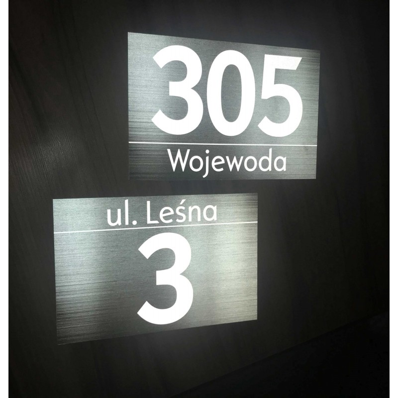 Tabliczka z płyty PCV spienionej o grubości 3 mm lub płyta DiBond z metalową płytą w środku z dowolnymi danymi, którą można zamontować na elewacji, drzwiach czy bramie. Tabliczka pokryta jest odblaskową folią o strukturze plastra miodu, która odbija światło id ziała na zasadzie znaku drogowego.