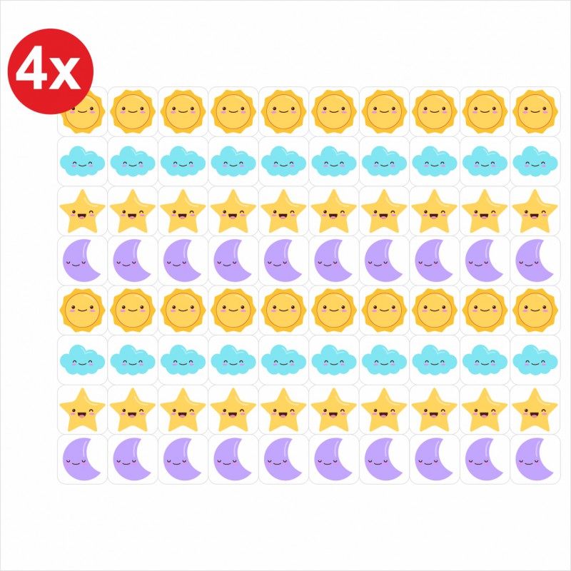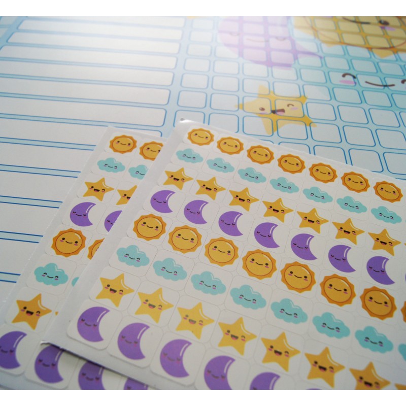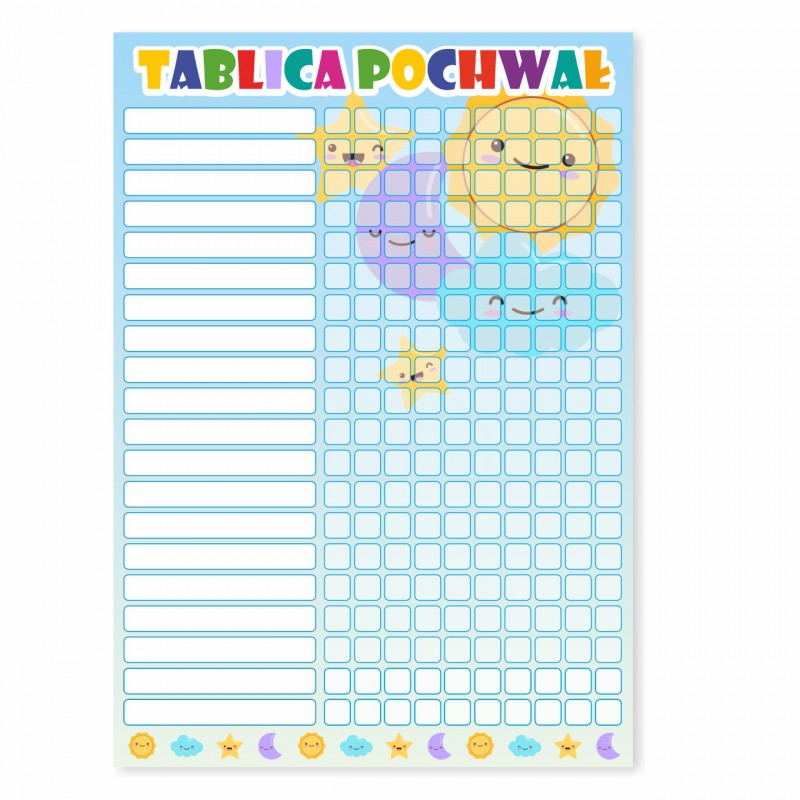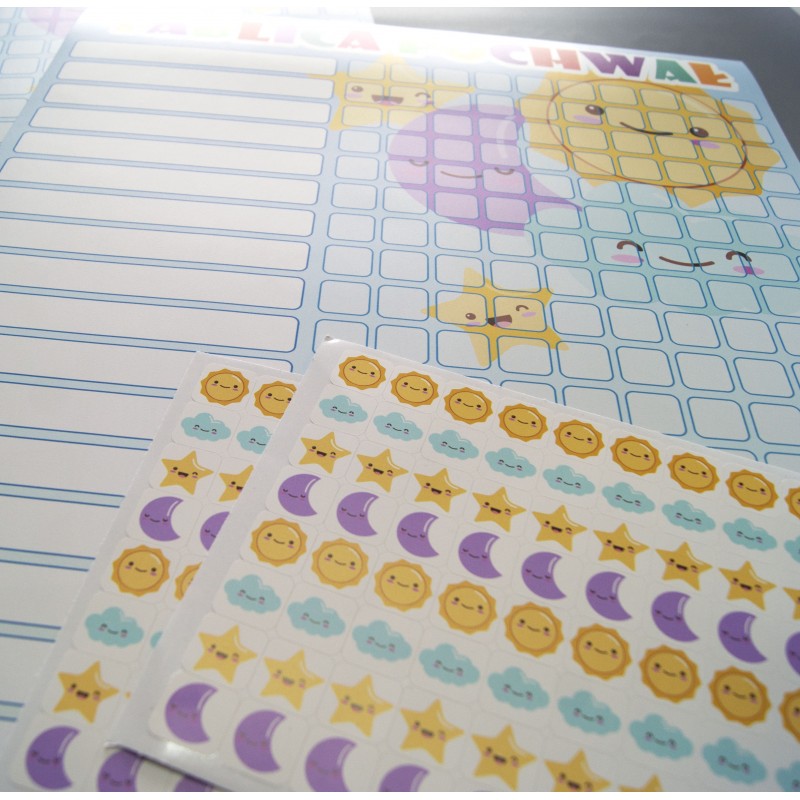 - wymiar A2 (42 x 59,4 cm) - wymiar pojedynczej naklejki 2 cm x 2 cm - druk na papierze plakatowym - w zestawie 4 arkusze naklejek po 80 sztuk - w sumie otrzymujesz 320 naklejek! - 20 okienek do własnoręcznego wpisania imion dzieci - przy każdym imieniu miejsce na 10 naklejek, które symbolizują otrzymanie kolejnej pochwały - idealne do motywowania dzieci w przedszkolu czy szkole - można ustalić dodatkowa nagrodę za zebranie odpowiedniej ilości naklejek