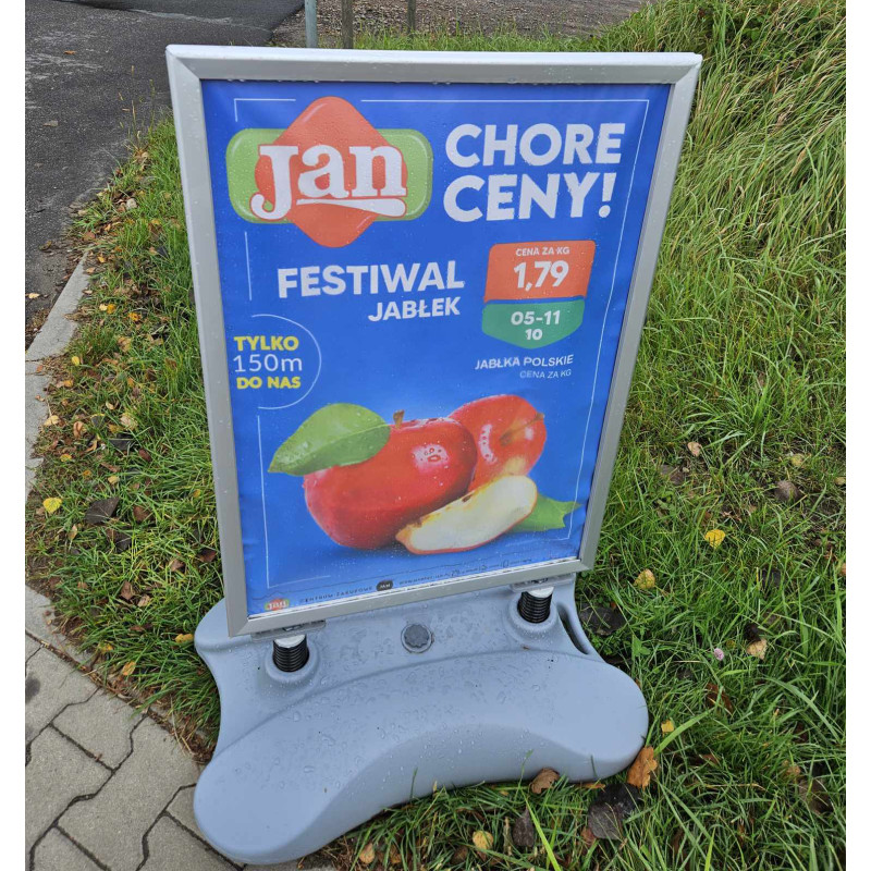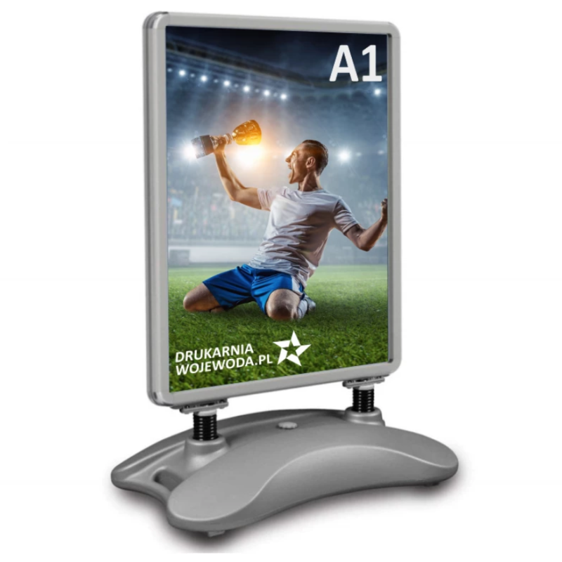 Potykacz Waterbase A1 łączy solidność i elegancję. Dzięki podstawie typu waterbase o pojemności 25 litrów, wypełnionej wodą lub piaskiem, konstrukcja uzyskuje wyjątkową stabilność – nie przewraca się przy wietrze. Kółka i rączka ułatwiają jego przesuwanie nawet przy pełnej wadze (~15 kg). Sprężynowa rama zapewnia amortyzację podmuchów, co zwiększa trwałość. System OWZ pozwala na szybką, beznarzędziową wymianę grafiki, a folia UV chroni plakaty przed utratą koloru. To profesjonalny stojak reklamowy do użytku zewnętrznego, łączący funkcjonalność i estetykę.
