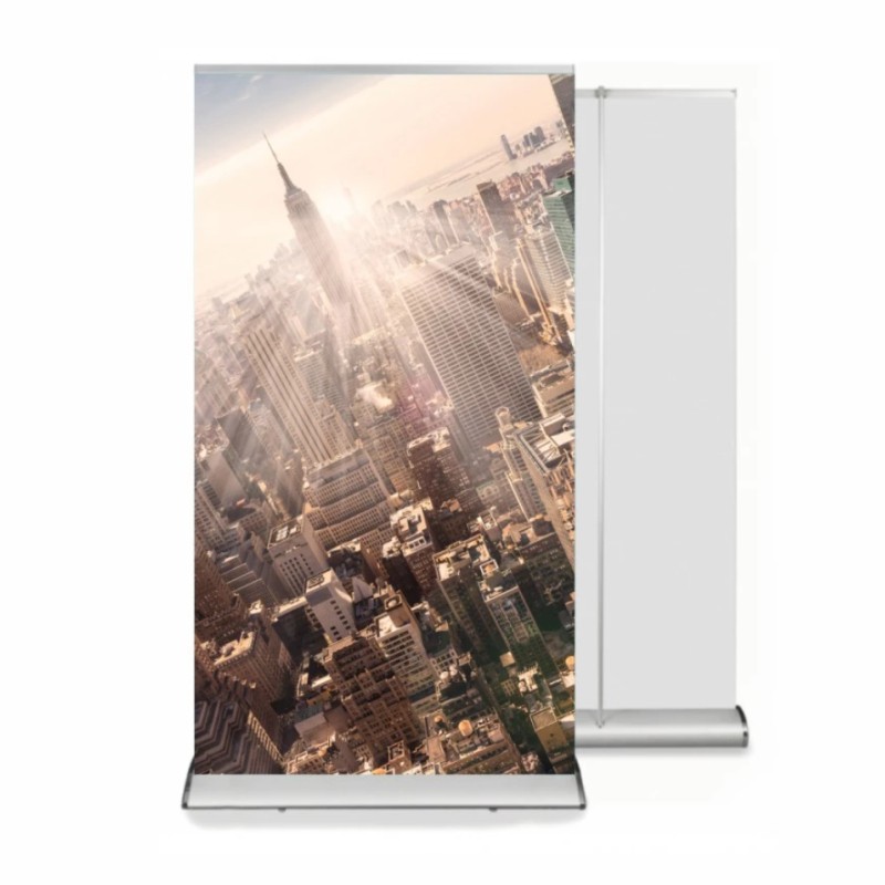 Roll‑up Premium to połączenie nowoczesnego designu, najwyższej jakości i trwałości. Solidna, lakierowana kaseta aluminiowa prezentuje się luksusowo i stabilnie utrzymuje wydruk Blockout, który dzięki swojej gramaturze (330 g) i matowej powłoce eliminuje prześwity — kolory są głębokie i żywe. Maszt teleskopowy wraz z zatrzaskową listwą umożliwia szybki montaż bez narzędzi — gotowy do pracy w kilka sekund. Torba transportowa z odpowiednią ochroną sprawia, że transport urządzenia jest bezpieczny i wygodny. To idealne rozwiązanie dla firm oczekujących stojaka reklamowego łączącego estetykę, funkcjonalność i prestiż.