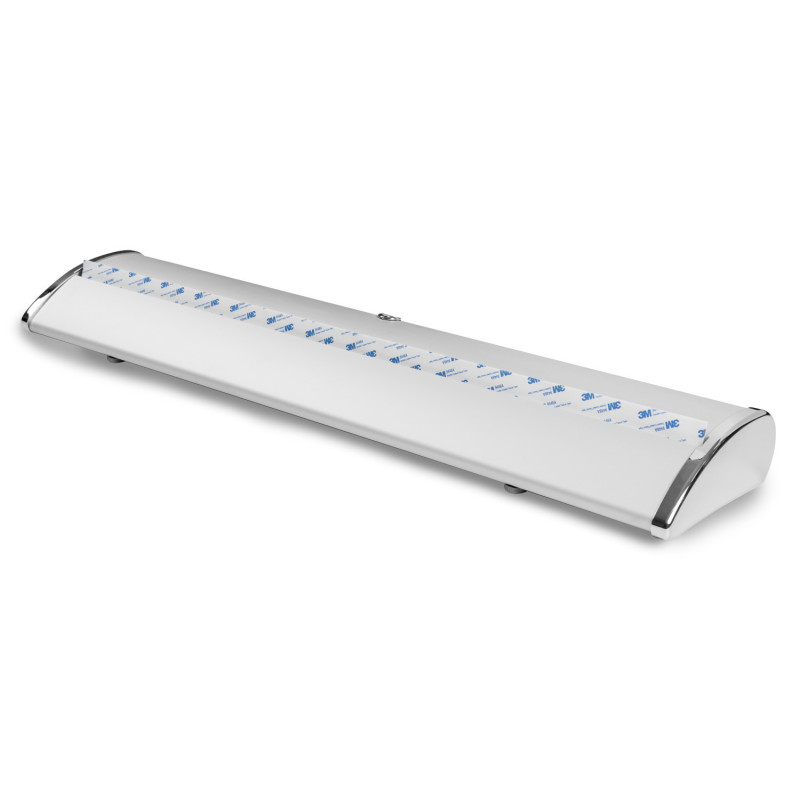 Opływowa, lakierowana proszkowo kaseta z grubego anodowanego aluminium, kolor srebrny.