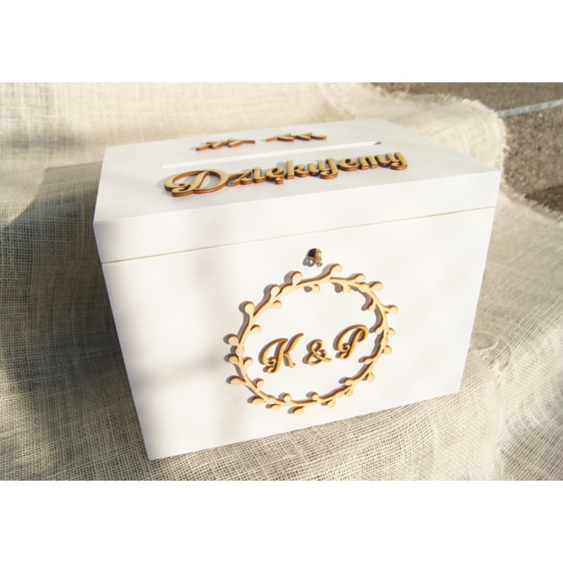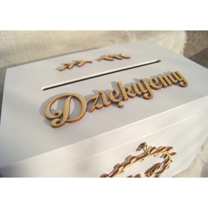 Drewniana biała skrzynka na koperty ślubne z kluczykiem