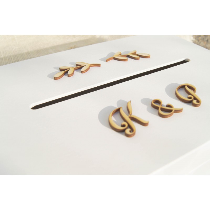 Pudełko możemy dopasować indywidualnie do Pary Młodej. Idealnie wpasuje się w styl rustykalny wesela i nie tylko. Napisy wycinamy metodą laserową, więc po wcześniejszym kontakcie zapewniamy możliwość dowolnej treści czy grafiki. Wycięte elementy doklejamy trwałym klejem lub taśmą montażową dwustronną, więc nie trzeba obawiać się o ewentualne odklejanie się napisów.