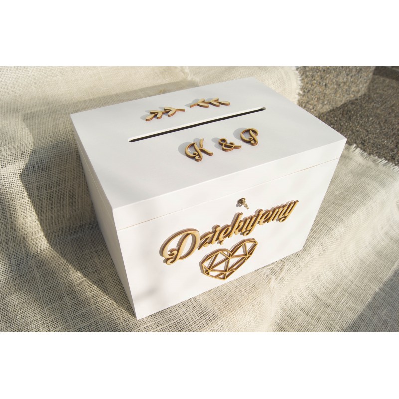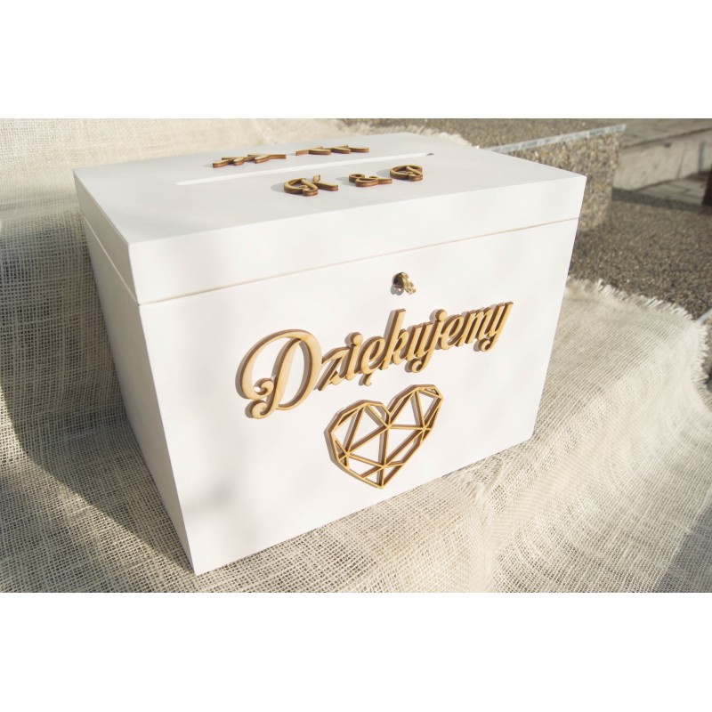 Drewniana biała skrzynka na koperty ślubne z kluczykiem