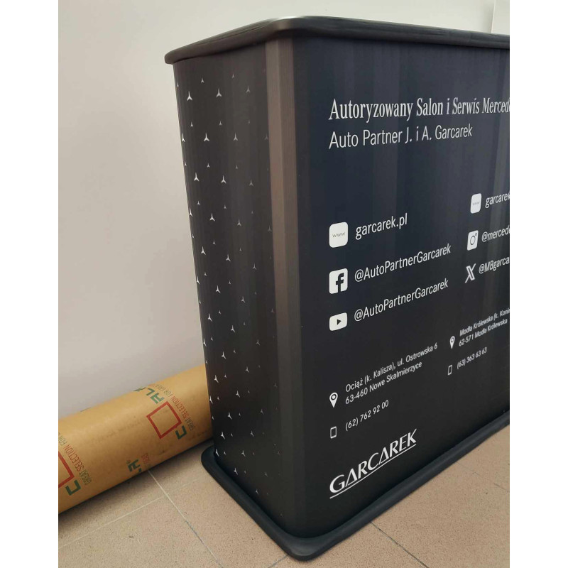To stoisko reklamowe łączy w sobie mobilność, estetykę i funkcjonalność. Lekka konstrukcja z PCV i szybki montaż oparte na rzepach sprawiają, że można je rozłożyć w mniej niż minutę, co doceni każdy specjalista od promocji. Estetyczny blat z opakowaniem w torbie transportowej zwiększają profesjonalny wygląd ekspozycji. Wydruk foliowy z laminatem UV gwarantuje, że grafika zawsze zachowa intensywność kolorów, a powierzchnia pozostanie odporna na zarysowania i warunki atmosferyczne. To doskonałe połączenie trwałości, mobilności i atrakcyjnej prezentacji.