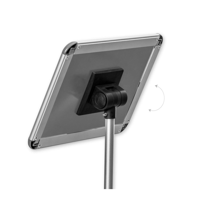 Stalowa podstawa gwarantuje wysoką jakość produktu, a piankowe nóżki chronią powierzchnię przed zarysowaniem. Wymiana grafiki odbywa się poprzez zatrzaskiwanie wydruku przy pomocy skrzydeł ramki, co zajmuje dosłownie kilka sekund. Niewielkie rozmiary po złożeniu ułatwiają transport i przechowywanie całego produktu.