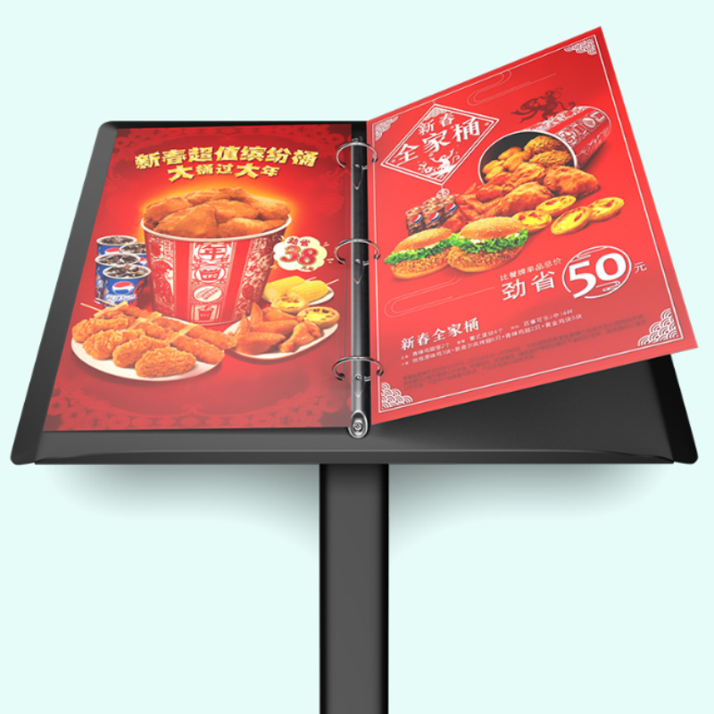 Stojak reklamowy typu potykacz tekstylny łączy w sobie mobilność i trwałość – solidna, metalowa podstawa gwarantuje stabilność, a estetyczne, srebrne wykończenie podkreśla profesjonalny charakter lokalu. Mechanizm segregatorowy nie tylko ułatwia wymianę kasetek z menu, lecz także pozwala na elastyczne dostosowanie treści do sezonowych potrzeb. To rozwiązanie, które harmonijnie wpisuje się w nowoczesne aranżacje gastronomiczne, biurowe i wystawiennicze.