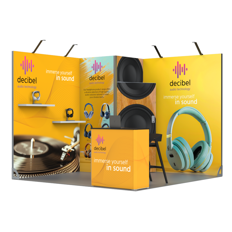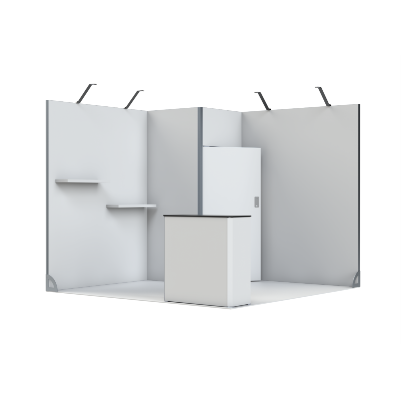 Użytkownik może w prosty sposób rozbudować stoisko o dodatkowe elementy, takie jak: oświetlenie punktowe, lady ekspozycyjne, uchwyty na broszury i inne akcesoria systemowe.