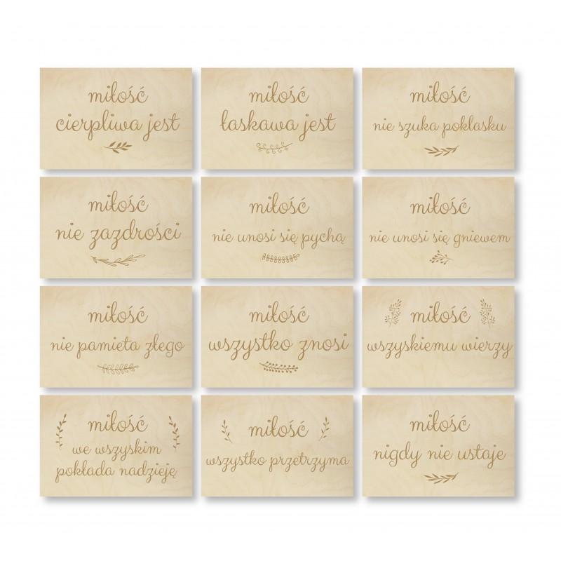 Komplet 12 tabliczek do dekoracji kościoła, domu Panny Młodej, czy sesji zdjęciowych.