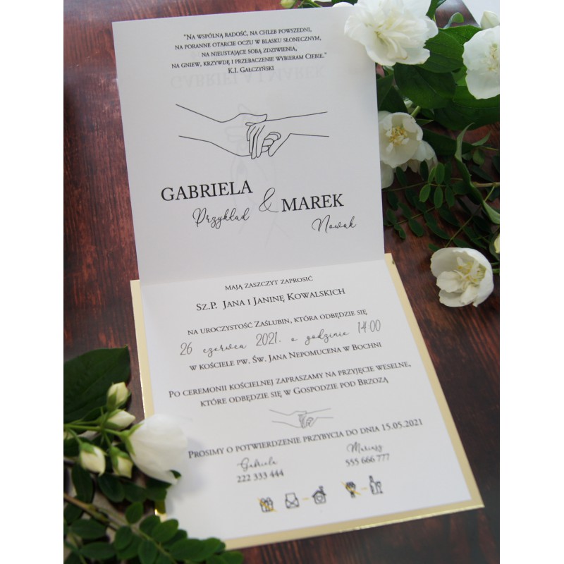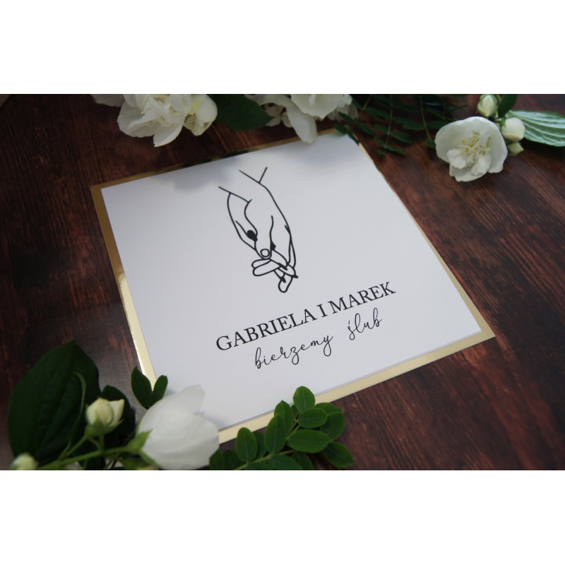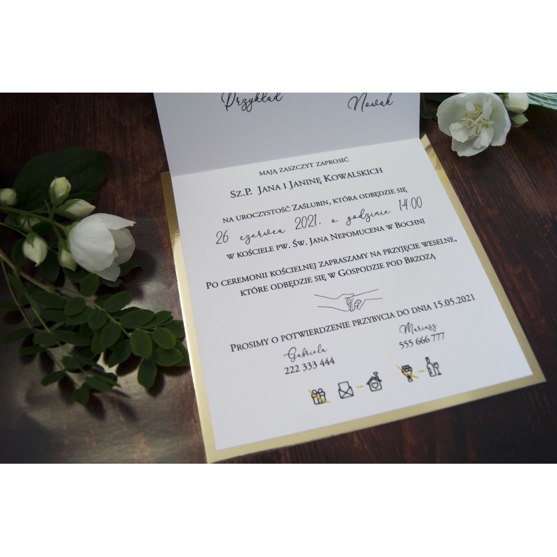 Podana cena zawiera gotowe zaproszenie 14,5 x 14,5 cm z poklejonym złotym lub srebrnym papierem oraz białą kwadratową kopertę. Potrzebujecie taki wzór w innym formacie? Prosimy o kontakt.